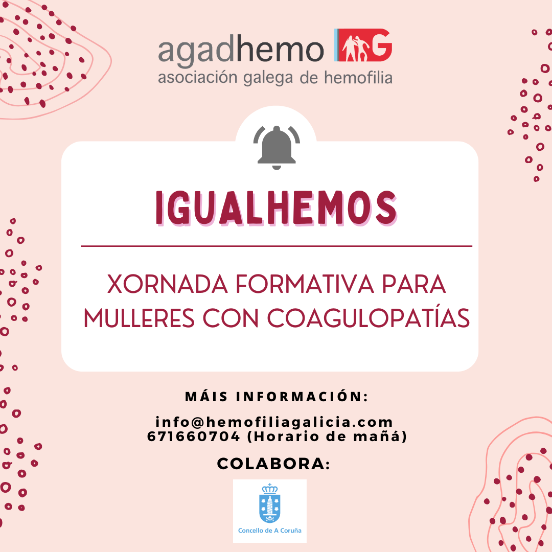 ✨ O proxecto IGUALHEMOS de apoio psicolóxico para mulleres con coagulopatías conxénitas da área sanitaria de A Coruña. 💬 Co apoio e colaboración do Concello de A Coruña, fomentamos o benestar emocional e o sentimento de pertenza. Xuntas fortalecémonos! #SaludMental #Coagulopatías #ACoruña Para consultar o programa definitivo e máis información podes contactar connosco: 📞 671 […]