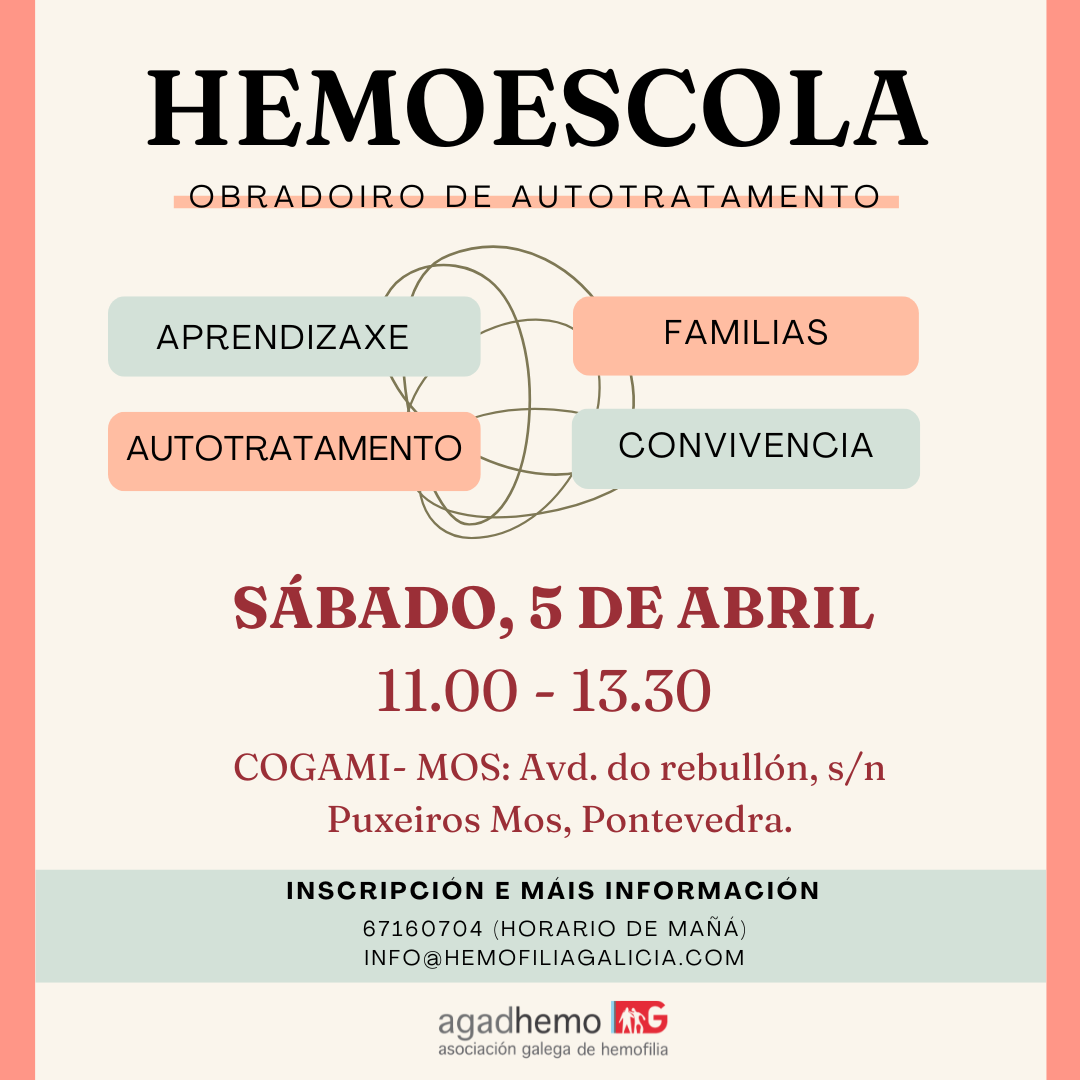 Agadhemo organiza unha nova edición da HEMOESCOLA (taller de autotratamento) o sábado día 5 de Abril en Mos, Pontevedra.