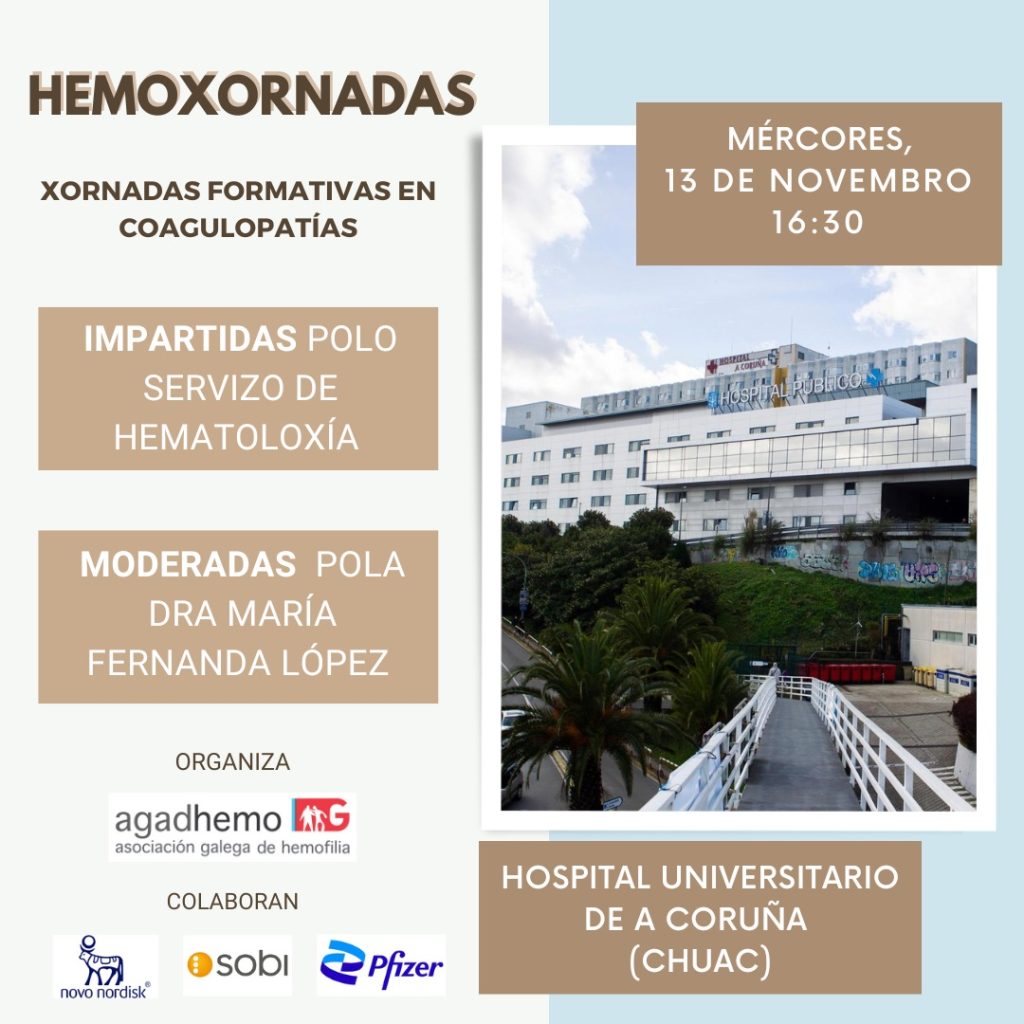 Desde Agadhemo convocamos una nueva jornada del proyecto " HemoXornadas Jornadas Formativas para personas con hemofilia u otra coagulopatías congénitas" con el objetivo de formar e informar sobre tratamientos, cuidados y la atención especializada.